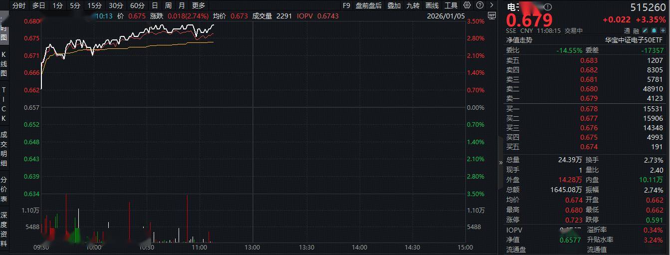 今日(1月5日)市场涨势红火,电子板块涨幅居前!截至发稿,电子板块获主力资金净流入268亿元,板块吸金额高居31个申万一级行业首位!热门ETF方面,荟聚电子板块核心龙头的电子ETF(515260)场内价格当前大涨3.35%,场内频现溢价区间,显示买盘资金更为强势,或有资金进场布局!