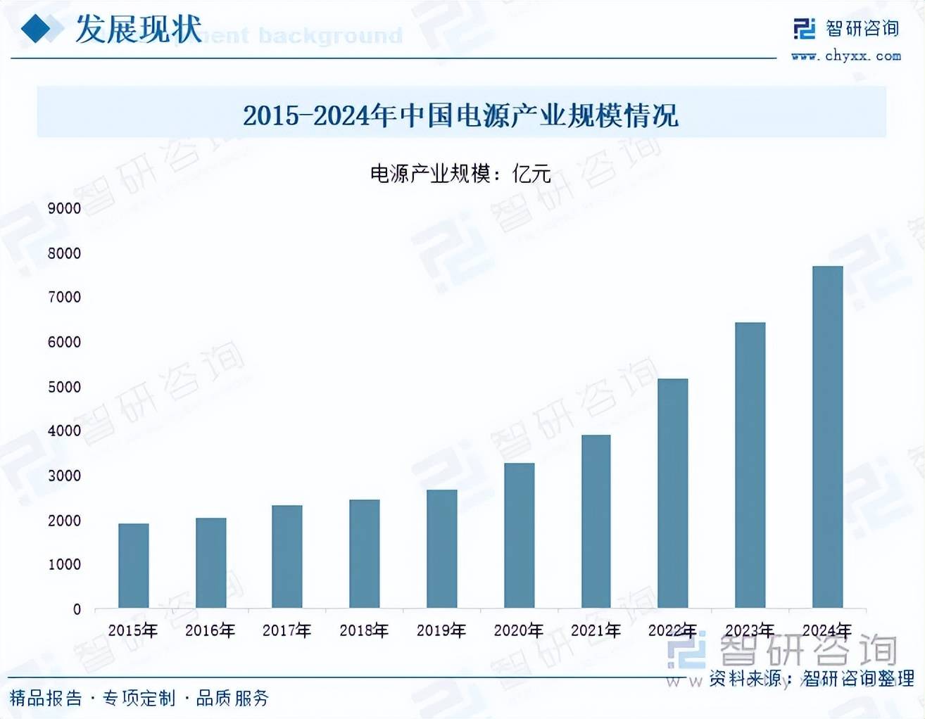 近年来,在国家提出新型基础设施建设概念与双碳战略的大背景下,随着中国经济的持续发展以及国家对新能源发电、储能、新能源汽车、5G通信轨道交通等电源应用行业的持续性投入,中国电源行业基本保持快速增长态势。另一方面因2019年底开始的新型冠状病毒肺炎疫情,上游原材料供应商、尤其是芯片,被迫涨价和交期延长,电源行业供应链和生产也存在一定程度的不畅或停滞,对行业发展产生了负面影响。虽然2020-2021年电源增速比往年高,但没有预期那样好。2022年好似蓄势待发的一年。虽然2022年中国工业自动化行业整体表现不佳,但新能源汽车、光伏、数据中心的增幅弥补了工业自动化的增速放缓,从而带动了电源行业的增长。2022年中国电源产业规模达到5174亿元,同比上涨32.3%。随后2023中国电源行业产业规模继续保持增长趋势,2024年达到7702亿元。