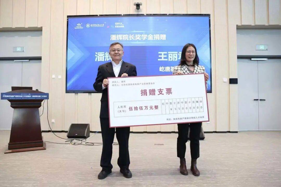 当天,联合体的多项合作项目及成果集中落地。北京科技职业大学分别与北京芯力技术创新中心、国家新能源汽车技术创新中心签署校企合作协议,共同开设“芯力订单班”与“国创中心订单班”,着力培养集成电路封测与车规芯片测试领域的高端技能人才;北方工业大学集成电路产教融合基地、研究生工作站正式揭牌,北方工业大学—胜科纳米就业实践实习基地同步成立;北京奕摩集成电路卓越工程师创新研究院首任院长潘辉与北方华创共同向北京屹唐集成电路发展基金会捐赠奖学金,助力产业人才成长。此外,AI驱动普惠智能芯片设计等5项集成电路创新项目进行了现场路演,集中展示了联合体在人才培养、校企协同、技术创新与成果转化等方面的综合成效。