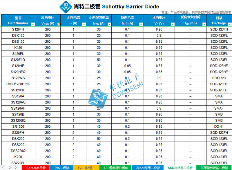 查阅“东沃产品选型表”可知,东沃200V肖特基二极管系列产品有: