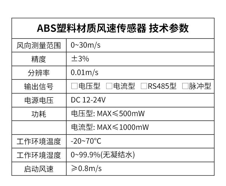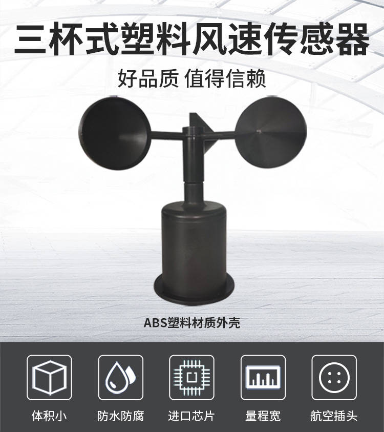 使用ABS材质的风速传感器通常出现在对成本、重量和耐腐蚀性有要求,但对极端环境耐受性(如长期超高温、超低温或强化学腐蚀)要求不是最顶级的场合: 民用气象站:家用或校园用小型气象站。 农业与环境监测:农田、森林、水域的风速监测。 工业与楼宇自控:通风系统、冷却塔、安全监控(如起重机工作风速测量)。 交通运输:高速公路沿线气象监测。 低功耗物联网设备:作为物联网节点的一部分,监测环境数据。