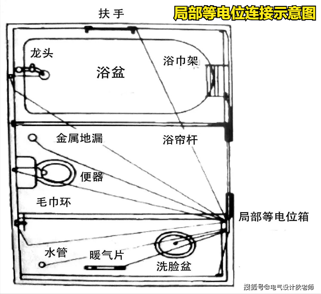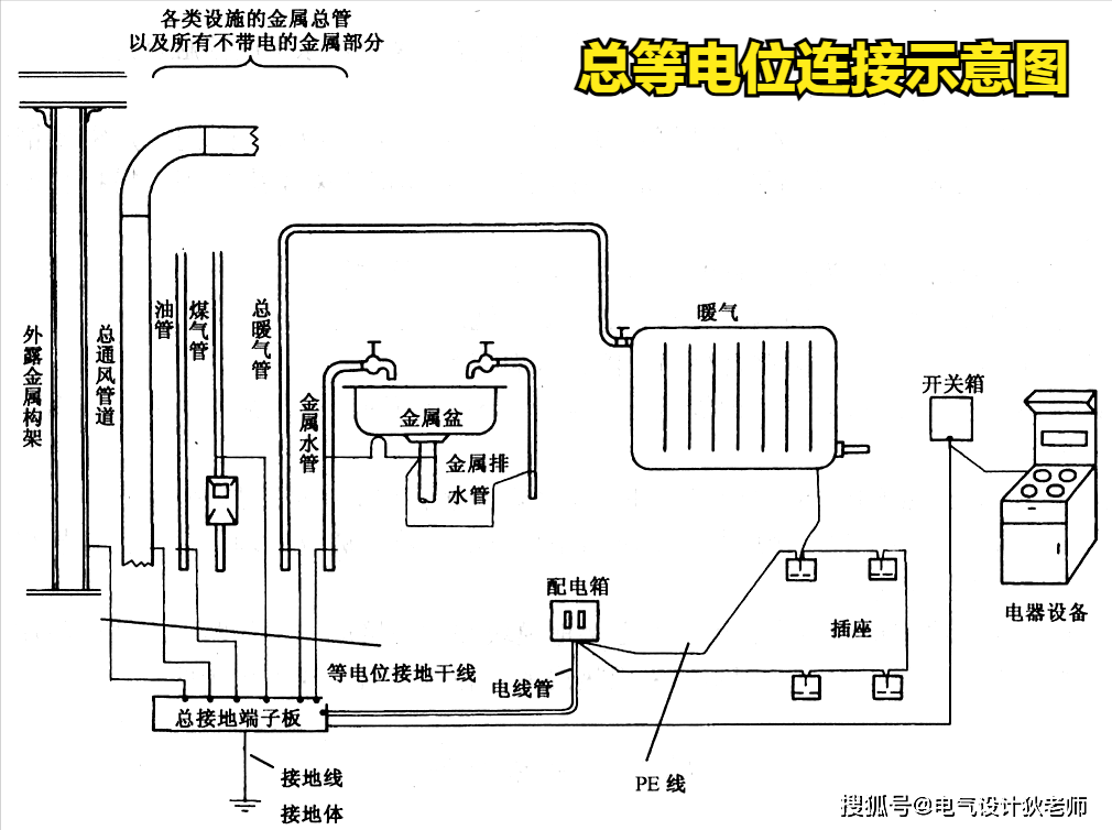 局部等电位连接是指在一个局部范围内,将同时能够触及的所有外露可导电部分连接形成等电位。通过局部等电位连接端子板将PE干线、公用设施的金属管道、建筑物金属结构等部分互相连通。