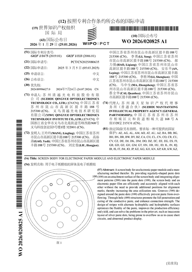 证券之星消息,根据企查查数据显示清越科技(688496)公布了一项国际专利申请,专利名为“用于电子纸模组的屏体及电子纸模组”,专利申请号为PCT/CN2025/080635,国际公布日为2026年1月29日。