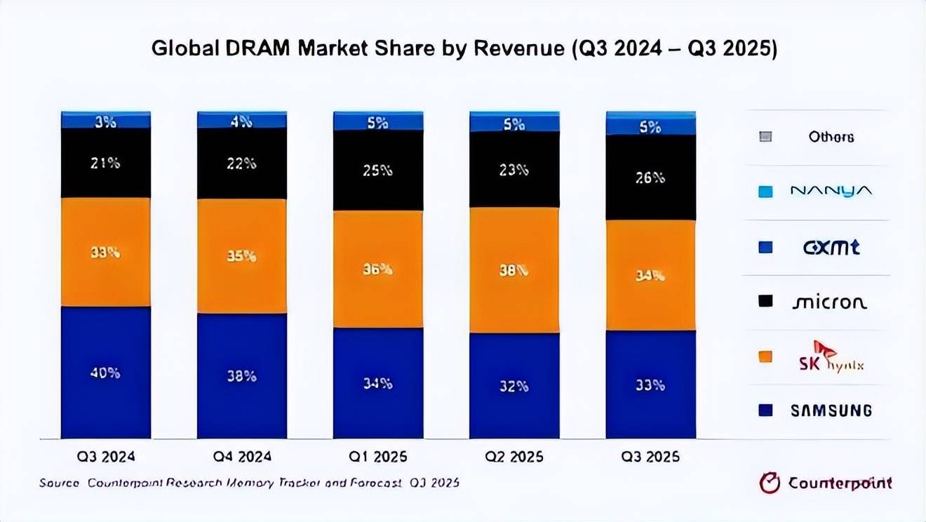 一方面是因为目前中国的内存芯片占比,真的还不高,无法撼动三星、SK海力士、美光的地位。按照之前机构的数据,到2025年三季度时,中国厂商长鑫在DRAM市场的份额为4%。