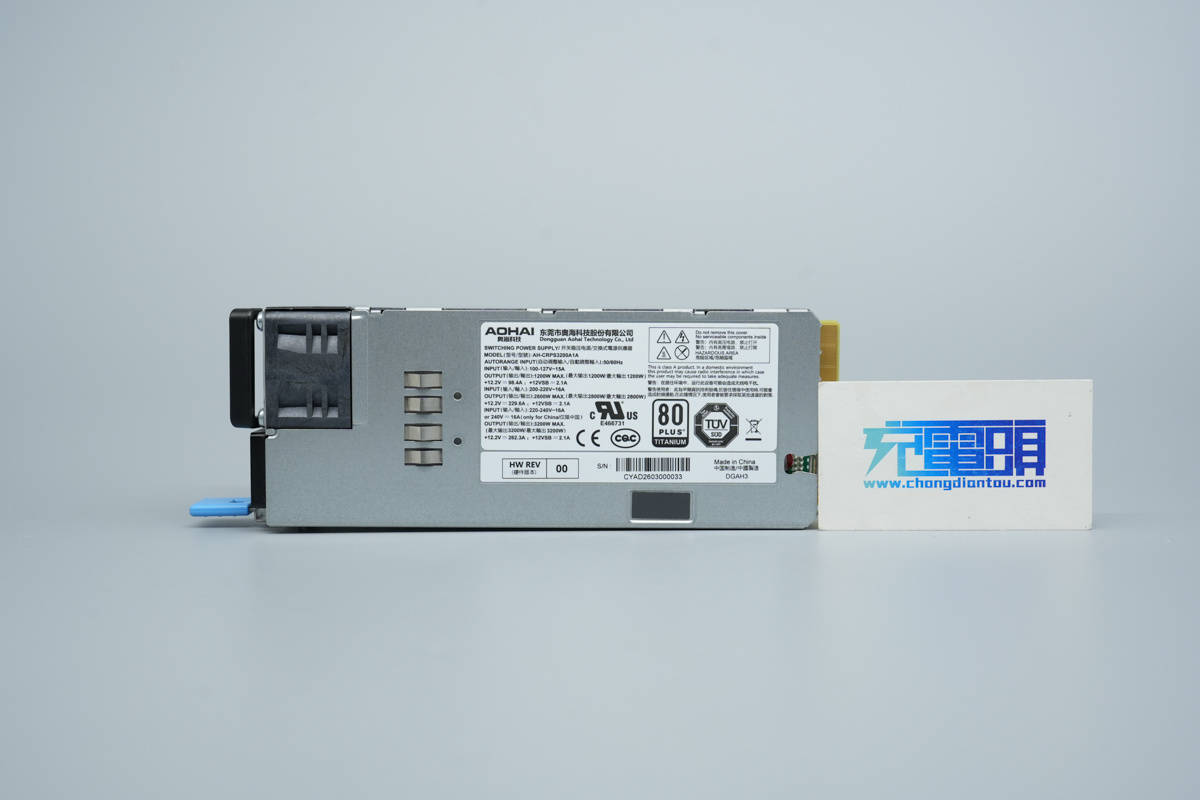 本期拆解带来的是奥海科技3200W钛金牌CRPS电源,电源型号为AH-CRPS3200A1A,支持100-240V交流和240V HVDC输入,通过了80PLUS钛金认证。电源额定输出电压为12.2V,输出电流262.3A,待机电源输出电压为12V,输出电流为2.1A。