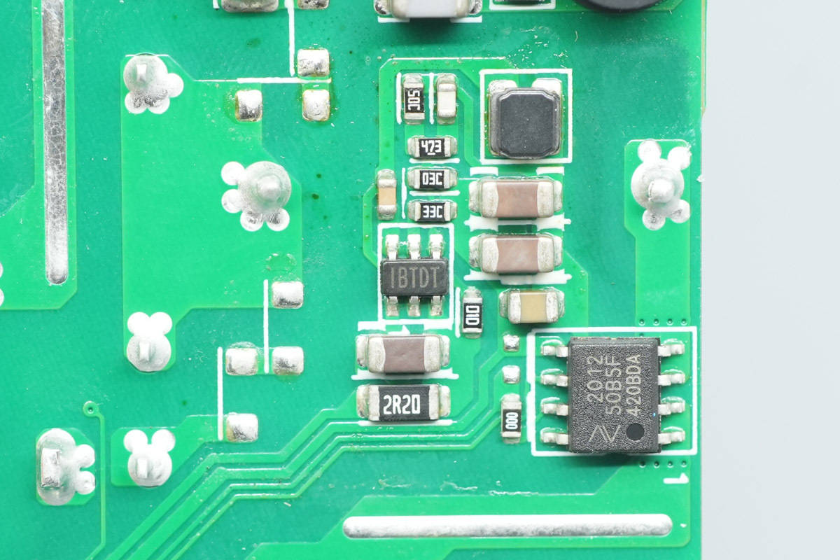 PCBA模块背面一览,右侧设有两颗整流二极管和电流采样芯片,谐振电容。下方设有驱动器和MLCC滤波电容。左侧设有输出控制管,隔离驱动器和待机电源芯片。