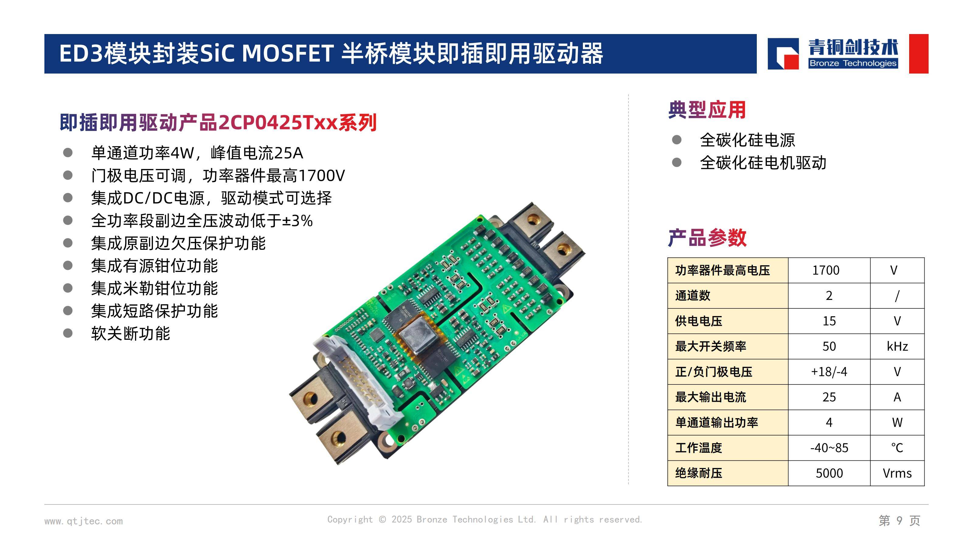 基本半导体及其合作伙伴青铜剑技术推出的专用驱动板(如BSRD-2427、BSRD-2503、2CP0225Txx-AB),从电路拓扑到保护逻辑,全方位适配了SiC的特性,是实现“无缝替代”的核心。