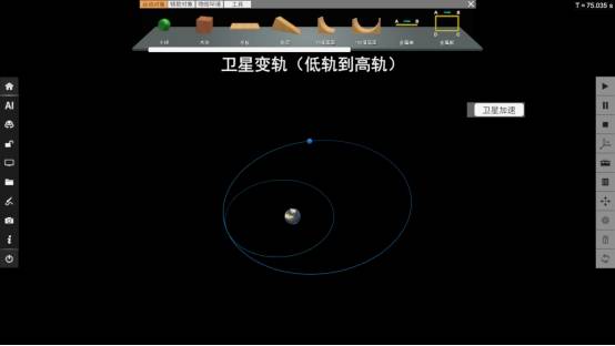 虚拟仿真的优势同样体现在宏观尺度的宇宙探索上。曾有教师应用矩道3D实验室进行“开普勒定律”和“卫星变轨问题”的教学。在虚拟太空环境中,学生可以自由调整行星轨道参数,直观观察面积守恒定律;能够通过拖动滑块为卫星加速,亲眼目睹其从圆轨道变为椭圆轨道,并深刻理解在不同轨道点上的速度与能量关系。这种将浩瀚宇宙“搬进”教室的体验,是任何黑板绘图或视频播放都无法比拟的。