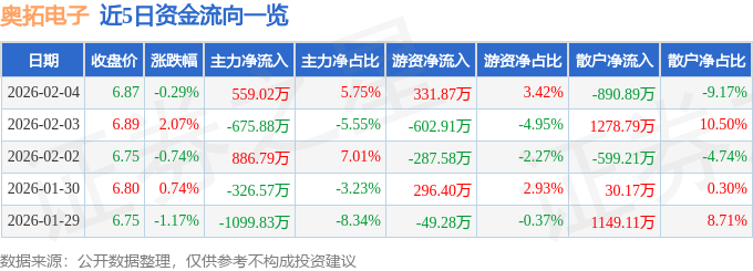 证券之星消息,截至2026年2月4日收盘,奥拓电子(002587)报收于6.87元,下跌0.29%,换手率2.66%,成交量14.17万手,成交额9717.79万元。