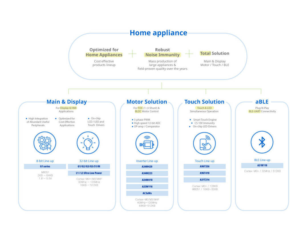 从主控显示、电机控制,到触摸交互与低功耗蓝牙,现代单片机(ABOV)在家电领域构建了完整而成熟的技术体系。它并非单点性能的堆叠,而是围绕家电应用场景,提供稳定、可扩展、易开发的整体解决方案。