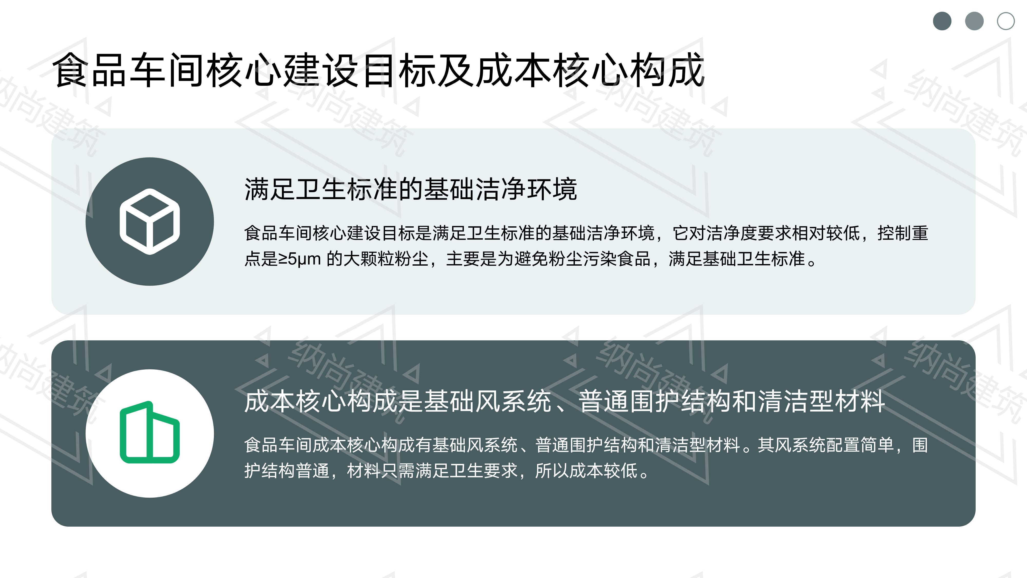 食品车间的核心建设目标是满足卫生标准的基础洁净环境,成本核心构成是基础风系统、普通围护结构和清洁型材料,价格低廉的原因是只需达到国标底线,无额外高端配置。