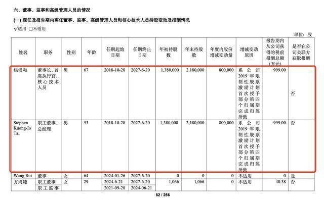 薪酬方面,2024年,公司董事长、首席执行官、核心技术人员杨崇和以及职工董事、总经理Stephen Kuong-Io Tai的年薪均为999万元。二人均为公司联合创始人。