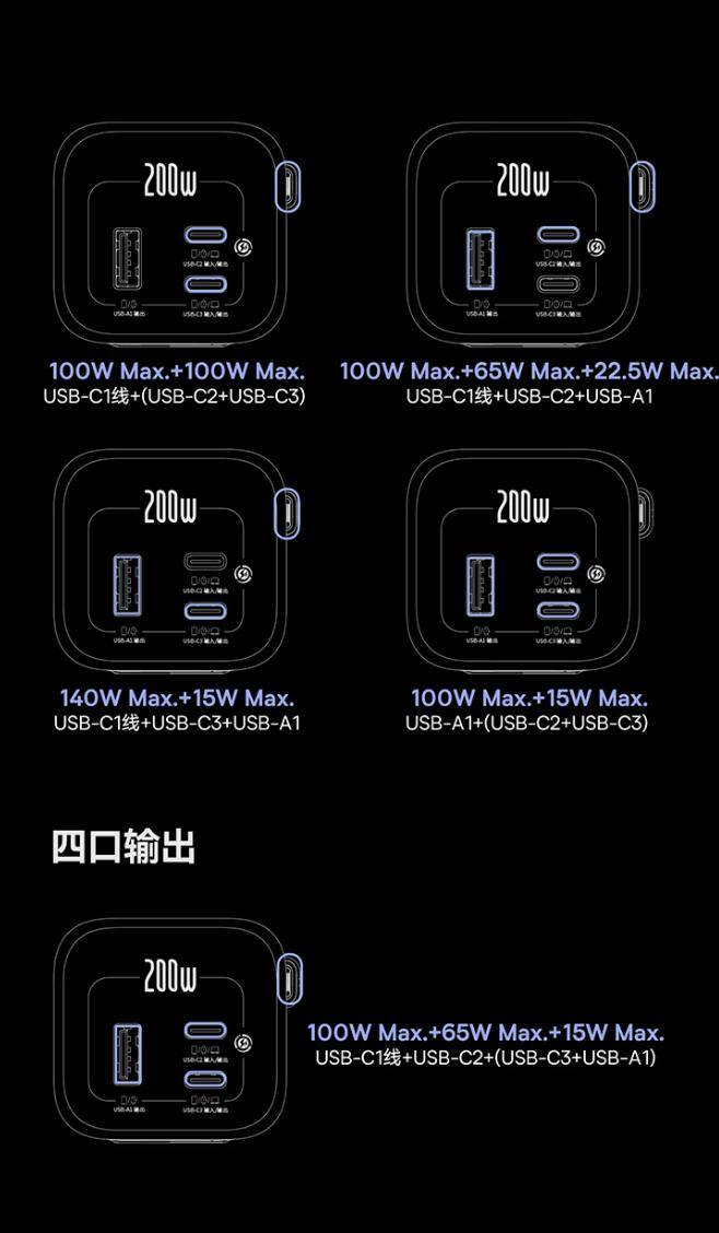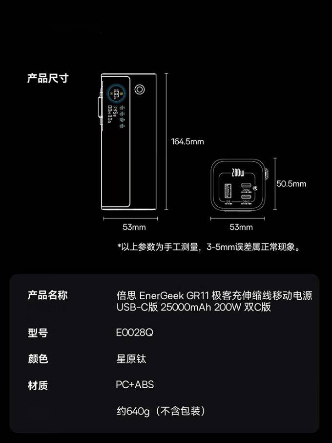 该移动电源整体采用银色配色,带有 LED 数显屏,提供 1 根伸缩式 USB-C 线及 1 根分离式 USB-C 线,其中 USB-C 线和 USB-C 接口均支持 100W 输出,USB-A 接口支持 22.5W 输出,在双口模式下可实现 100W + 100W 供电。