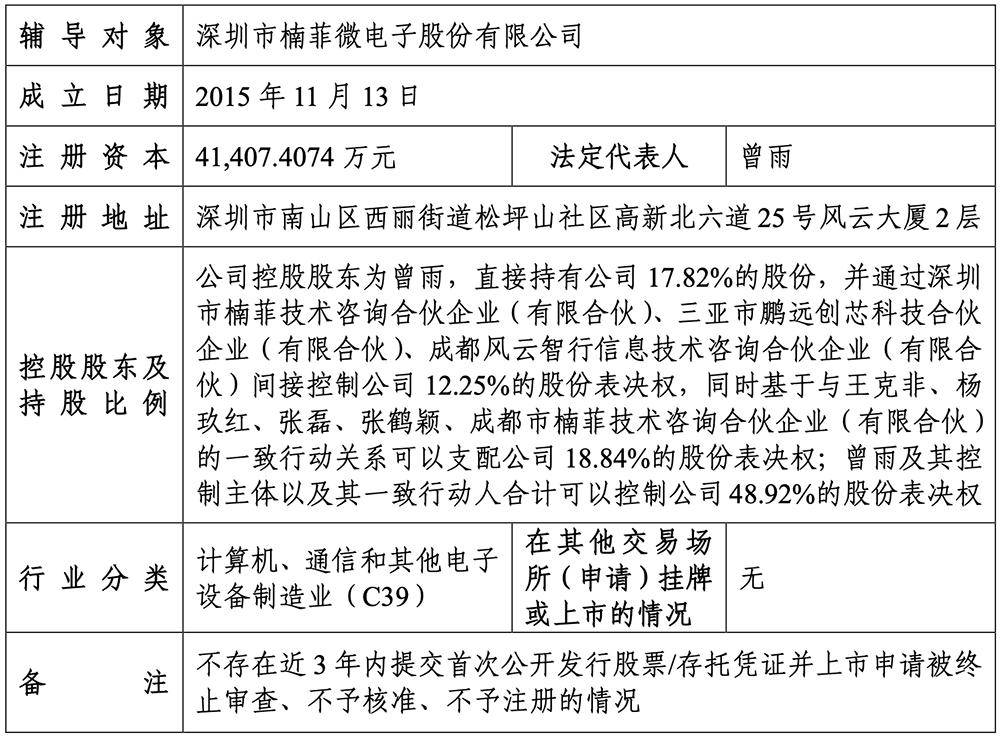 楠菲微电子成立于2015年11月,注册资本为4.14亿元,法定代表人、控股股东是董事长曾雨。曾雨直接持股17.82%,与其控制主体及一致行动人合计可控制该公司48.92%的股份表决权。
