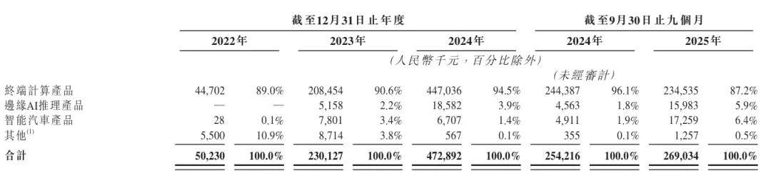 爱芯元智2025年前9个月来自终端计算产品收入为2.34亿元,占比为87.2%;来自边缘AI推理产品收入为1598万元,占比为5.9%;来自智能汽车产品收入为1726万元,占比为6.4%。