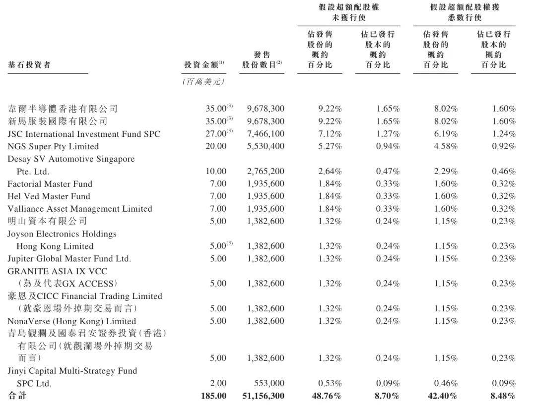 明山资本有限公司、Joyson Electronics Holdings、Jupiter Global Master Fund、GRANITE ASIA IX VCC、豪恩及CICC Financial Trading、NonaVerse (Hong Kong) 、青岛观澜及国泰君安证券投资(香港)有限公司(就观澜场外掉期交易而言)分别认购500万美元,Jinyi Capital Multi-Strategy Fund认购200万美元。