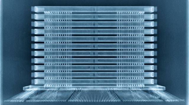 HBM是DRAM行业利用3D芯片封装技术来应对摩尔定律放缓步伐的尝试。每个HBM芯片由多达12个被称为裸片的薄化DRAM芯片组成。每个裸片包含许多被称为硅通孔(TSV)的垂直连接。这些裸片相互堆叠,通过与TSV对齐的微观焊球阵列连接。这个DRAM塔——厚度约为750微米,更像是一个野兽派办公楼而非塔楼——然后堆叠在被称为基础裸片的器件之上,基础裸片在存储器裸片和处理器之间传输数据。