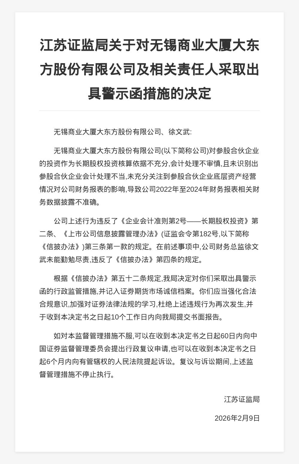 决定书显示,无锡商业大厦大东方股份有限公司对参股合伙企业的投资作为长期股权投资核算依据不充分,会计处理不审慎,且未识别出参股合伙企业会计处理不当,未充分关注到参股合伙企业底层资产经营情况对公司财务报表的影响,导致公司2022年至2024年财务报表相关财务数据披露不准确。