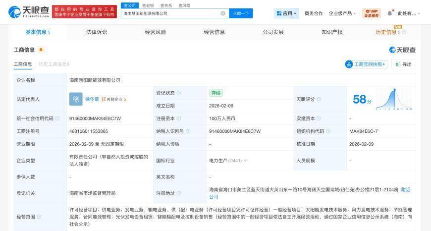 天眼查显示,近日,海南慧阳新能源有限公司成立,法定代表人为徐华军,注册资本100万人民币,经营范围含供电业务,发电业务、输电业务、供(配)电业务,太阳能发电技术服务,风力发电技术服务等。股东信息显示,该公司由阳光电源旗下合肥春阳新能源投资有限公司全资持股。