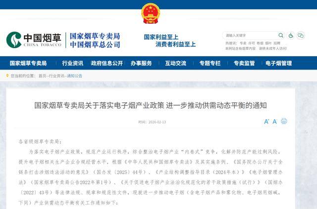国家烟草专卖局官网13日发布《国家烟草专卖局关于落实电子烟产业政策 进一步推动供需动态平衡的通知》,全文如下: