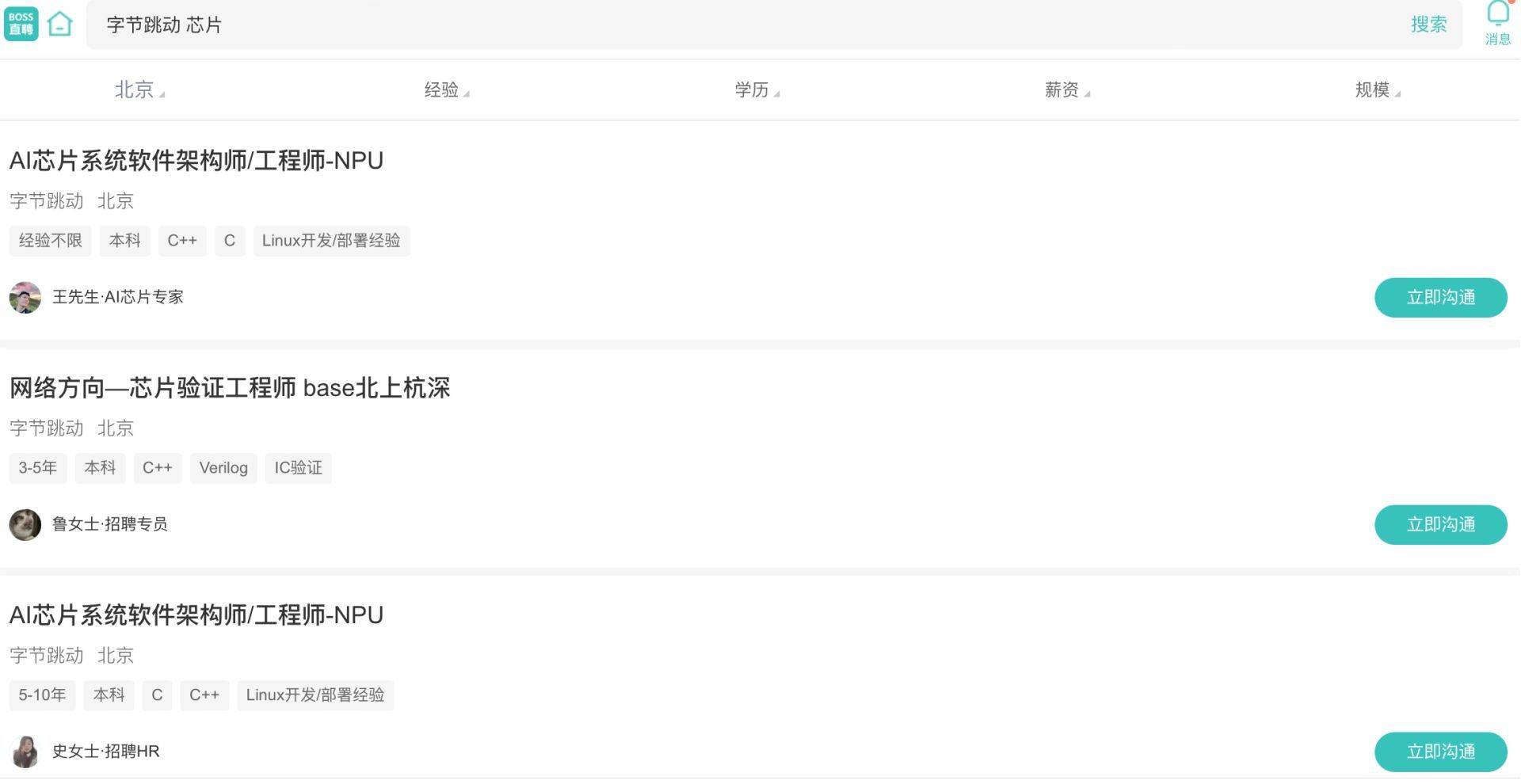 近日,市场先后传出消息称,字节跳动今年计划至少生产10万颗AI推理芯片以及AI芯片团队扩招。对此,《每日经济新闻》记者向字节方面求证,截至发稿均未获回应。但记者通过招聘软件发现,字节跳动“AI芯片系统软件架构师/工程师-NPU”“网络方向—芯片验证工程师”等岗位都正在招聘。