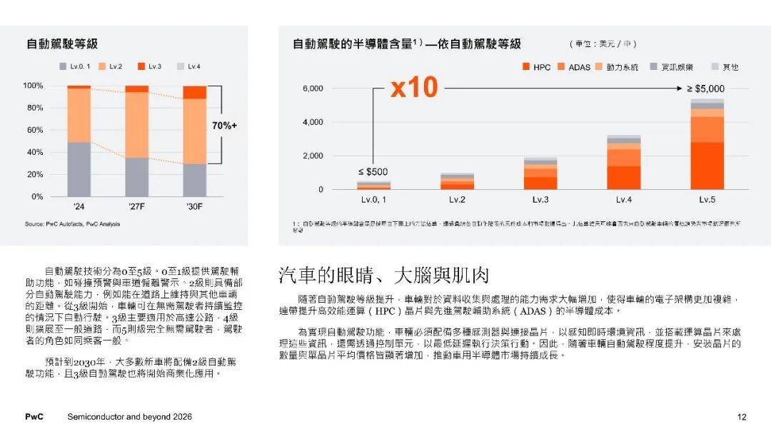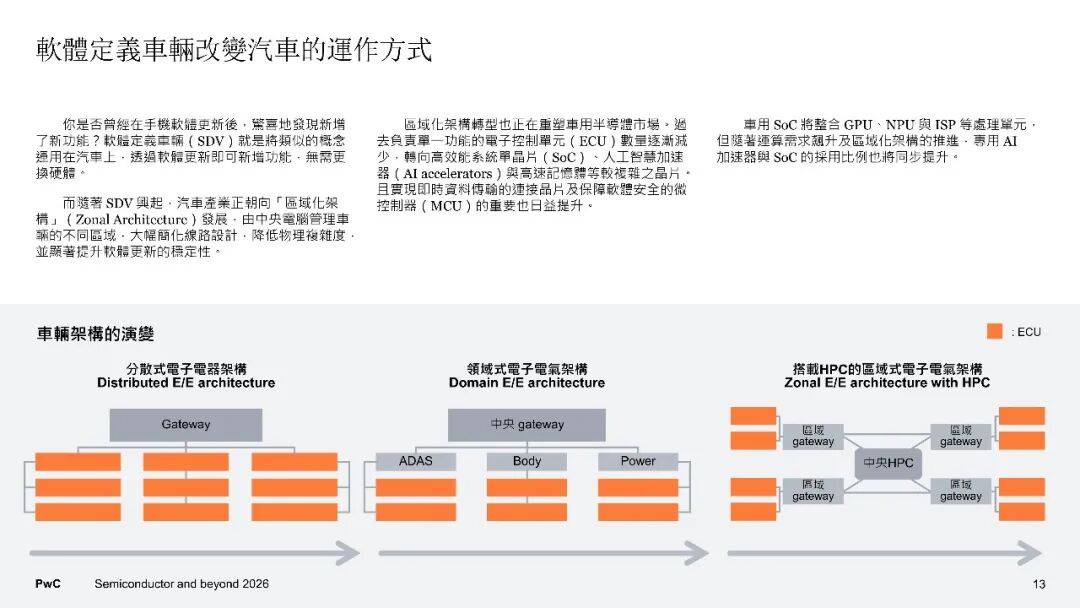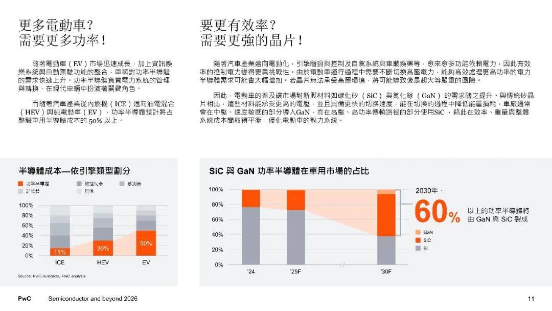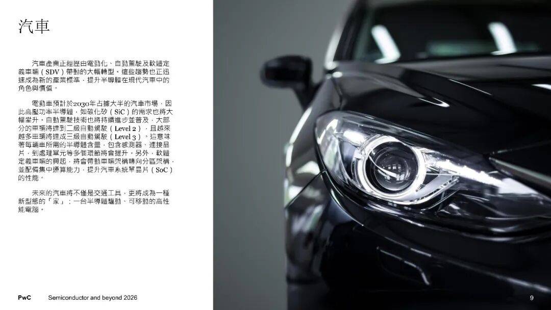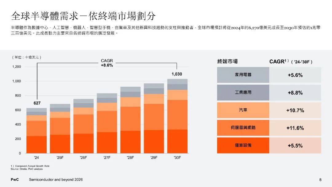 在需求端,全球半导体市场有着这样的规模预期,从2024年的6270亿美元开始增长,一直增长至2030年的1.03万亿美元,年均复合成长率达到8.6%。其中部分领域呈现不同态势,服务器以及网络领域,是受到生成式AI的驱动,凭借11.6%的成长率位居榜首 ;车用半导体,它是在电动化与自动驾驶等因素推动下、以10.7%的成长率紧跟其后。电动车在2030年将会成为市场主流,碳化硅与氮化镓等宽能隙功率半导体的占比将会超过60%,每一车的半导体含量,从传统的200至300颗增加到千颗以上。汽车受软件定义推动,进而促使分区架构以及中央运算得以发展,致使车用系统单芯片的需求急剧大幅爬升。在服务器端,AI加速器于数据中心芯片里所占的比例将会达到50%,高频宽记忆体摇身一变构成瓶颈以及战略物资。终端设备展现出明确的AI化趋向,AI PC以及AI手机引领神经网路处理器、低功耗DRAM以及影像讯号处理器实现升级,家电同样因为AI以及物联网功能的提升,从而推动连网芯片以及电源管理芯片的需求。智慧制造、再生能源、医疗电子以及国防自主,共同驱动着工业领域,功率半导体这类,微控制器之类,还有感测器,它们的需求呈现出稳健扩张的态势。