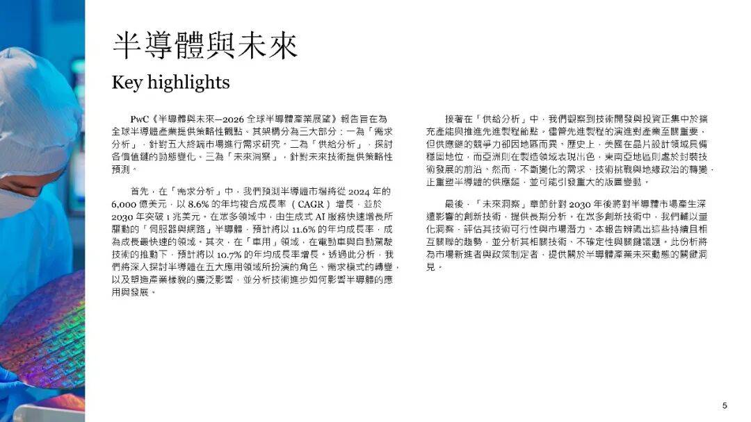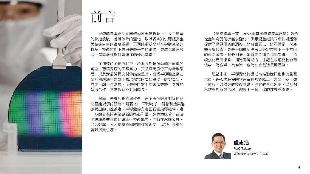 《2026全球半导体展望报告》由普华永道即PwC发布,它会对全球半导体产业,在需求、供给以及未来技术这三大维度的关键趋势给以全面剖析。该报告指出,半导体正从关键的零部件转变成为跨产业创新的核心发动机,人工智能、地缘政治以及供应链韧性正重塑着产业格局。