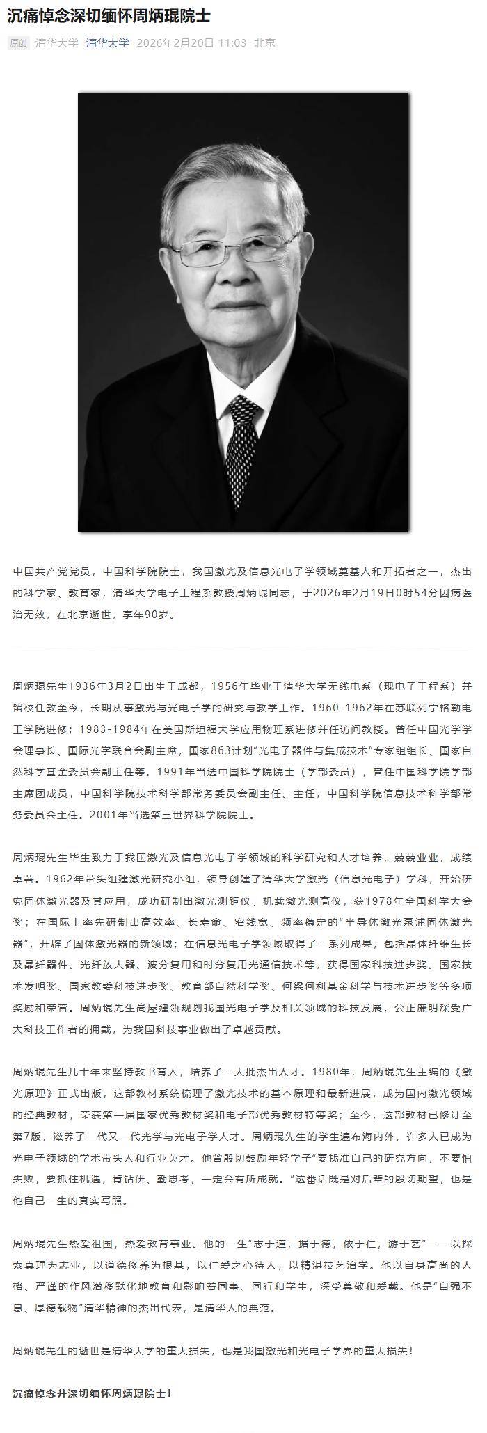 IT之家 2 月 20 日消息,清华大学今日发布讣告,中国科学院院士,我国激光及信息光电子学领域奠基人和开拓者之一,杰出的科学家、教育家,清华大学电子工程系教授周炳琨同志,于 2026 年 2 月 19 日 0 时 54 分因病医治无效,在北京逝世,享年 90 岁。