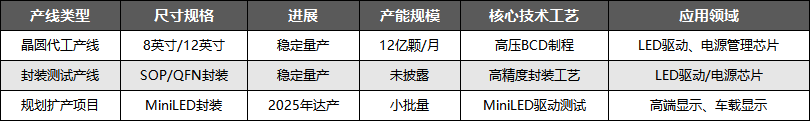 产能布局方面,公司采用“委外晶圆代工+自建封装测试线+规划扩产项目”的多维度布局策略,既巩固了LED显示、消费电子的基本盘,又成功卡位高端显示、车载电子、新能源等高增长领域,产能规划与行业需求趋势高度契合,具体产线详情如下: