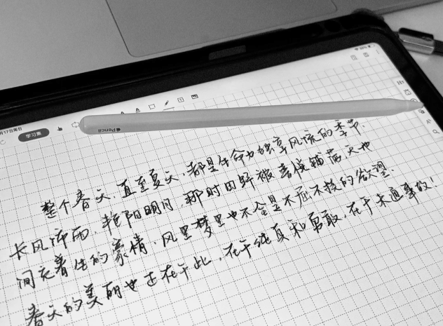 书写体验更是这款电容笔的核心优势,其与Apple Pencil的贴合度极高,尤其是笔尖部分,采用了与原装笔同源的POM材质,不仅导电性出色,能实现精准响应,耐磨性能也十分优异,长期使用也不易出现磨损、卡顿的情况。搭载的倾斜压感识别技术,可精准捕捉笔杆倾斜角度的细微变化,落笔流畅顺滑,线条粗细、深浅过渡自然,还原真实纸笔书写的质感;再加上全屏防误触功能的加持,书写时手掌可自然贴合iPad屏幕,无需刻意悬空,有效避免误触干扰,进一步提升了书写的准确性与舒适度,日常记笔记、画草图、做批注都能轻松胜任。