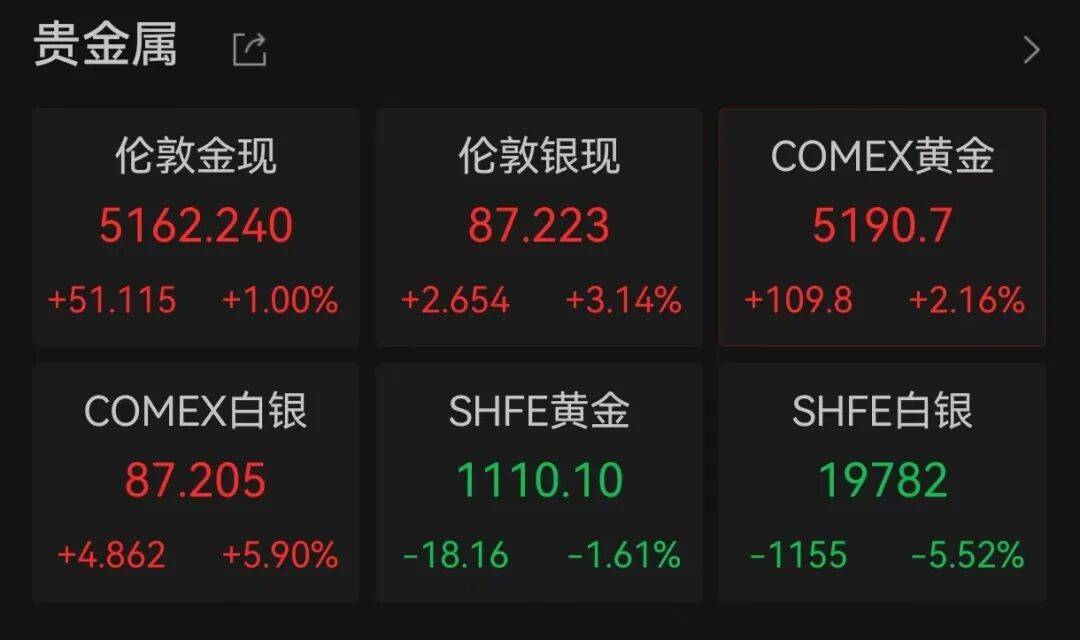 消息面上,金价银价今日迎来上涨,截至发稿,伦敦金现涨1%,报5162.24美元/盎司,伦敦银现涨3.14%,报87.223美元/盎司。