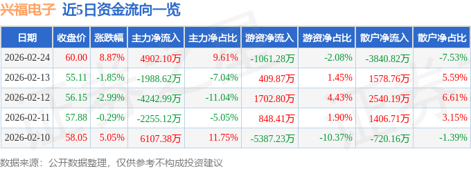 证券之星消息,截至2026年2月24日收盘,兴福电子(688545)报收于60.0元,上涨8.87%,换手率4.88%,成交量8.89万手,成交额5.1亿元。