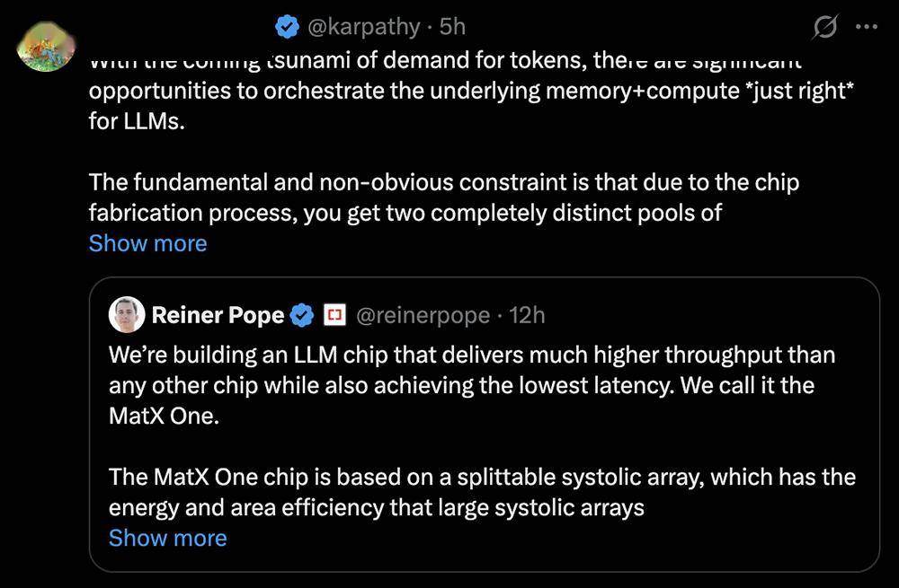 Andrej Karpathy在社交平台上分享了他参投MatX的想法。
