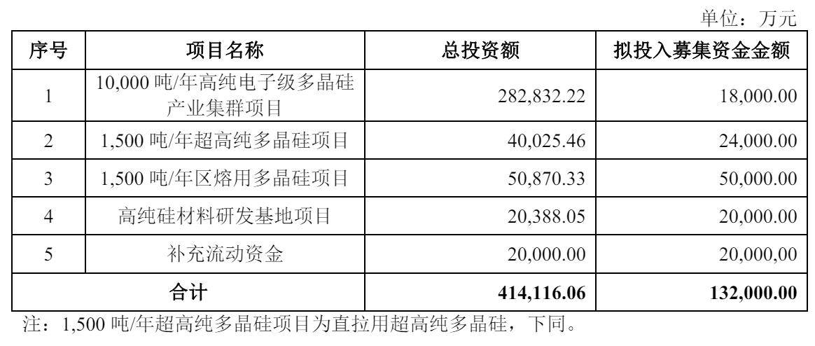 鑫华半导体计划募资13.2亿元,其中,1.8亿元用于10,000 吨/年高纯电子级多晶硅产业集群项目,2.4亿元用于1,500 吨/年超高纯多晶硅项目,5亿元用于1,500 吨/年区熔用多晶硅项目,2亿元用于高纯硅材料研发基地项目,2亿元用于补充流动资金。