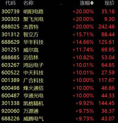 具体来看,CPO板块走高,明阳电路、聚飞光电、杰普特、鸿远电子等多股涨停。