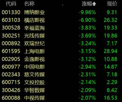 影视院线板块调整,博纳影业跌停,横店影视跌近7%,幸福蓝海、光线传媒、欢瑞世纪等股跟跌。