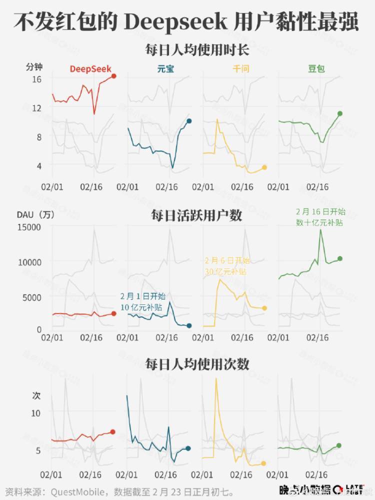 然而补贴退坡后用户迅速回落。截至2月23日,元宝几乎回到节前水平,千问因持续补贴下跌较小,豆包维持在1亿左右,而DeepSeek日活稳定数倍于元宝、接近千问。