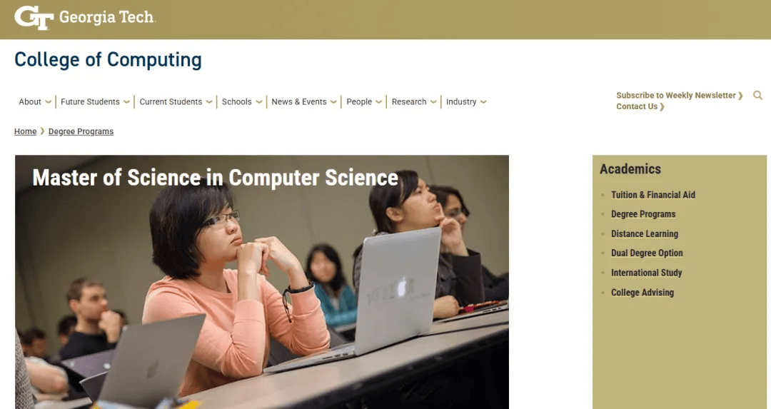 特点:佐治亚理工的计算机科学硕士学位课程,学生可以从11个分支方向中选择一个,包括计算感知与机器人学、人机交互、机器学习、可视化分析等专业,AI专业与亚马逊 AWS 合作,提供边缘计算与自动驾驶领域的企业级项目。