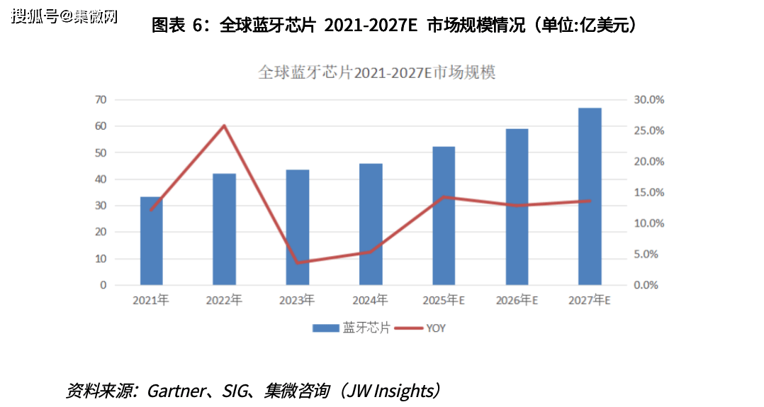 据Gartner数据, 2024年全球蓝牙芯片市场规模约为45.8亿美元,随着蓝牙芯片智能终端需求量的增加及蓝牙芯片价值量的提升,蓝牙芯片整体市场规模预计将继续保持较快增长。集微咨询预测,2025年蓝牙芯片市场规模可达 52.3亿美元,到 2027年达到67 亿美元,三年CAGR 约为14%。
