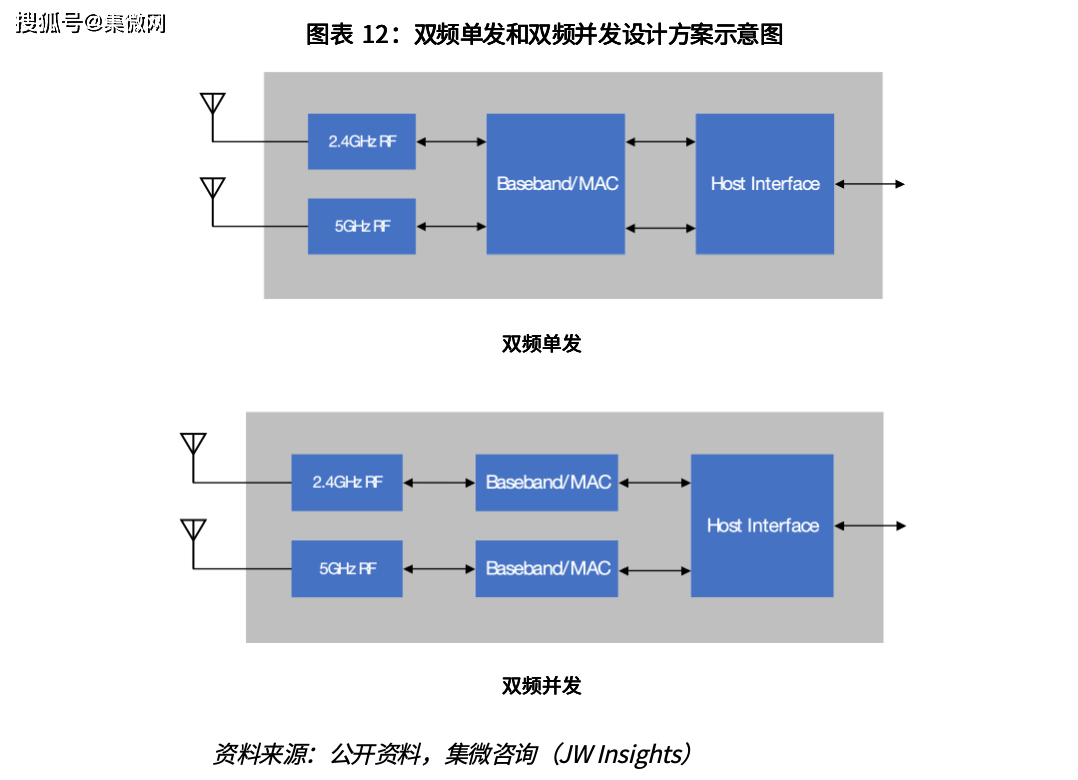 为兼顾两个频段的优点,一种可选方案是双频单发,该方案只包含一个WLAN 基带/MAC模块及两个独立(2.4GHz和 5GHz)的射频模块,借助一定的切换方案对射频模块进行选择,这种做法需要软件调度策略做到灵活且具备实用性;另一种方案是多频并发,该方案通过增加WLAN 基带/MAC模块,采用相对简单的调度策略应对更复杂的应用场景,如中继。