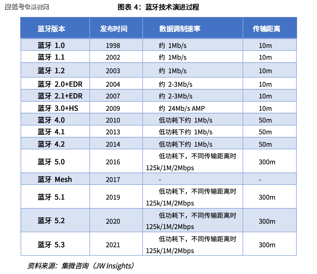 蓝牙技术最早由爱立信公司在 1995 年提出,主要应用于蓝牙音频领域。随后, 1998 年蓝牙技术联盟 SIG 成立,制定和维护蓝牙技术标准。 2010 年蓝牙 4.0 发布,最 大传输速率达 24Mbit/s ,2016 年蓝牙 5.0 推出,传输能力进一步提升,同时功耗降低 至毫安甚至微安级别。 2021 年, SIG 发布了蓝牙 5.3,功耗降低的同时还新增了经典蓝牙 BR/EDR 的安全性。