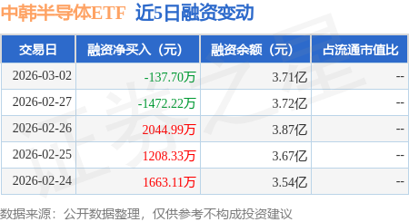 证券之星消息,3月2日,中韩半导体ETF(513310)融资买入2.24亿元,融资偿还2.26亿元,融资净卖出137.7万元,融资余额3.71亿元,近20个交易日中有11个交易日出现融资净买入。