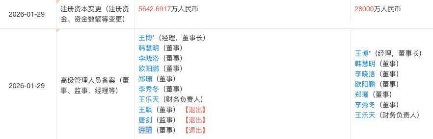 天眼查显示,2026年1月29日,公司注册资本由5642.7万元,增至2.8亿元,增幅近400%。王飙、许玥退出董事。