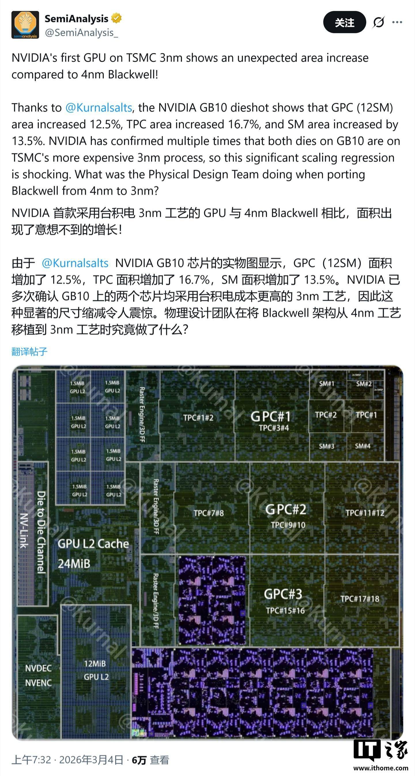 IT之家注:Die-Shot(裸片图)是指芯片内部物理结构的显微照片或布局图,用于分析芯片的具体设计和各区域面积。