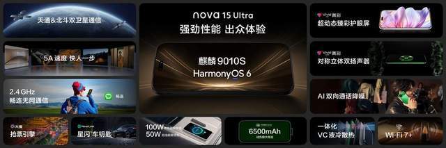 性能方面,nova 15 Ultra和nova 15 Pro搭载麒麟9010S芯片,与鸿蒙操作系统 6实现深度协同优化,确保了整机性能的稳定释放。并且还有6500mAh大电池与快充的组合,确保了用户在全天候使用中的续航保障。