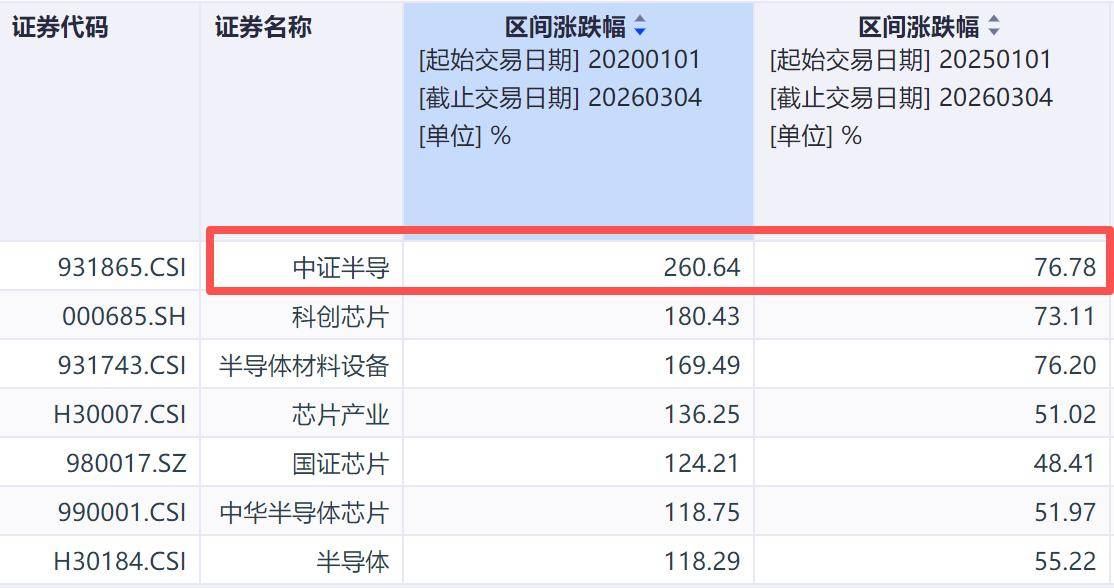 这个ETF跟踪的是中证半导,目前A股规模比较大的几个芯片指数,还有科创芯片和半导体材料设备,但是从2020年还有2025年至今的表现来看,中证半导区间涨幅第一。其他指数更不用看了,远远不如中证半导。