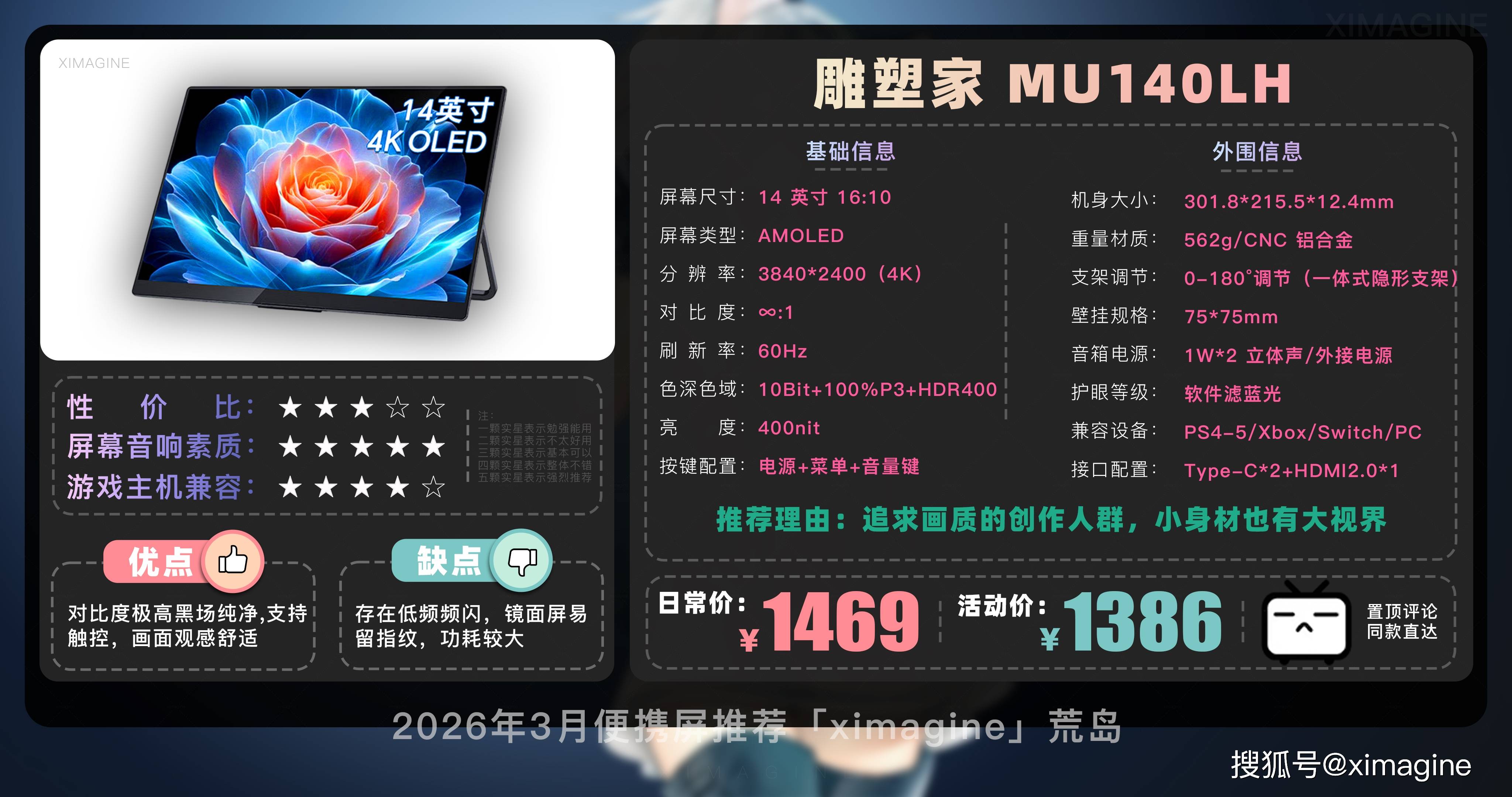 以上就是本期26年3月便携屏推荐清单,如果有心水的型号,可以戳置顶评论区对应链接拿下!如果只是想在通勤路上刷刷网页 14 英寸基础款就足够,如果是个对画质有执念的设计师,那么 OLED 高刷旗舰绝对值得多掏几百块钱,毕竟我们买的不仅是一块屏幕,更是一份随时随地开启高效状态的自由。如果觉得内容有所帮助,请关注荒岛,有你们的支持是我持续更新的动力!如果对选购便携屏还有疑问,欢迎在评论区留言我会尽快回复大家。本期就到这,我是「ximagine」下期再会!