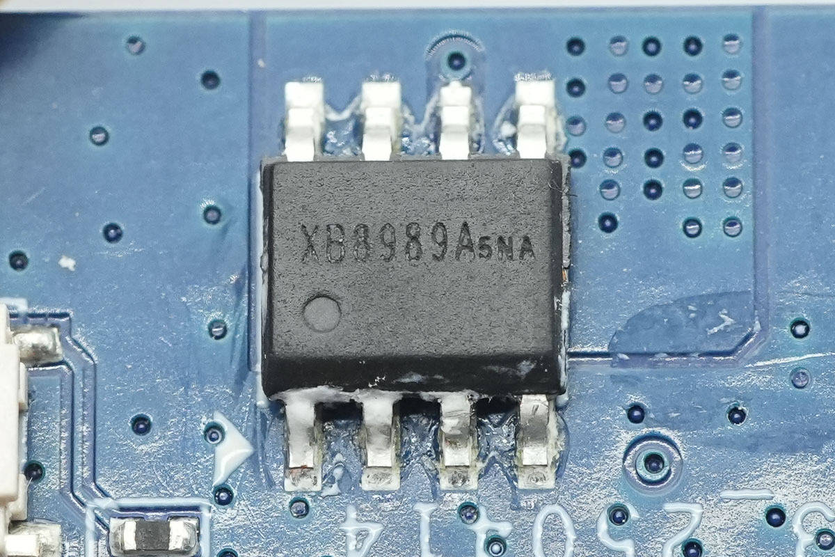 最后来看PCBA主板,正面设有移动电源主控芯片、电感、锂电保护芯片。