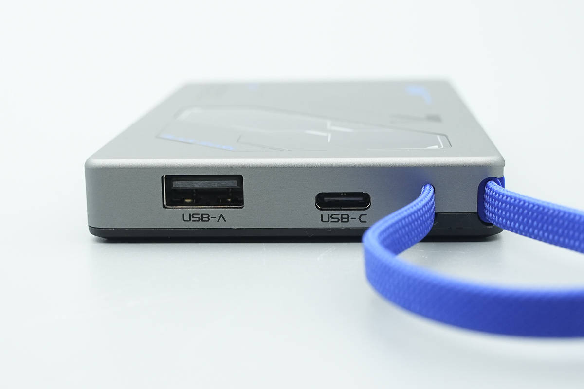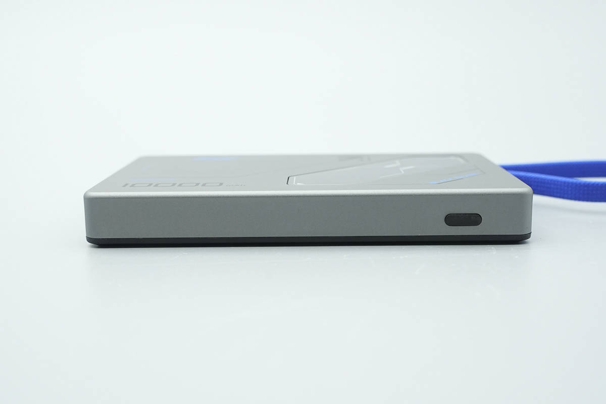接下来看产品本体,移动电源机身采用扁平卡片式造型,外壳为深灰配色,正面用蓝色线条点缀,风格偏电竞机甲感,科技潮流感十足。
