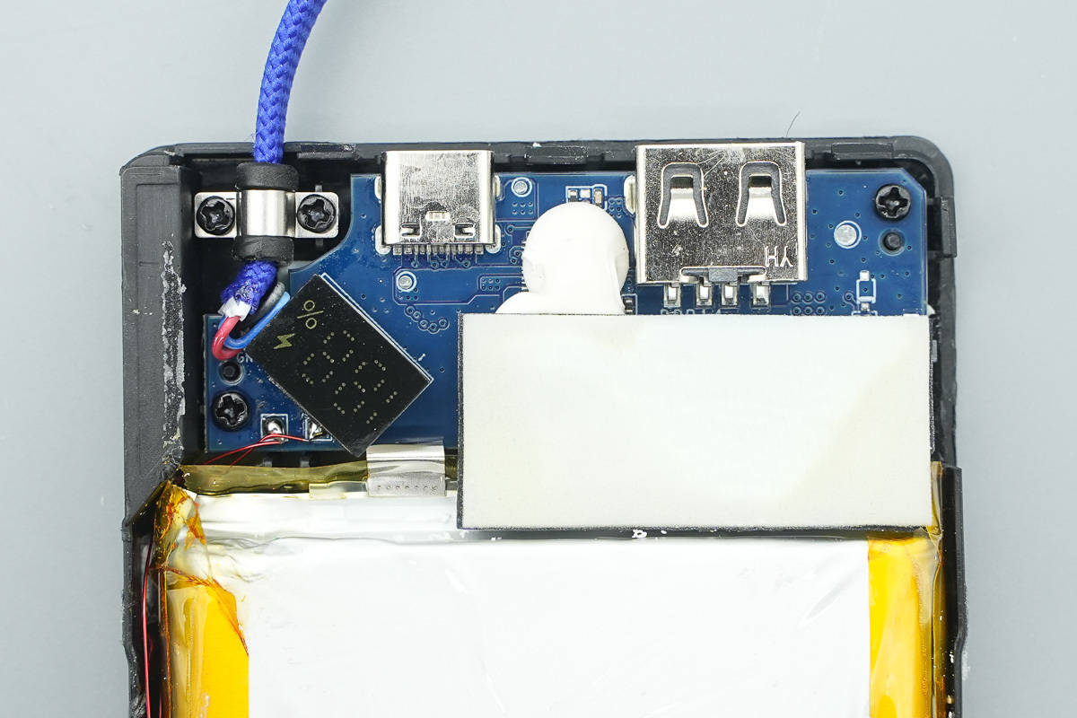 接下来看PCBA模块区域,PCB板跟外壳之间用十字螺丝固定,板上焊接 USB-C 和 USB-A 接口,自带线通过金属压板和螺丝固定,电感和主控芯片区域贴有大面积导热贴。